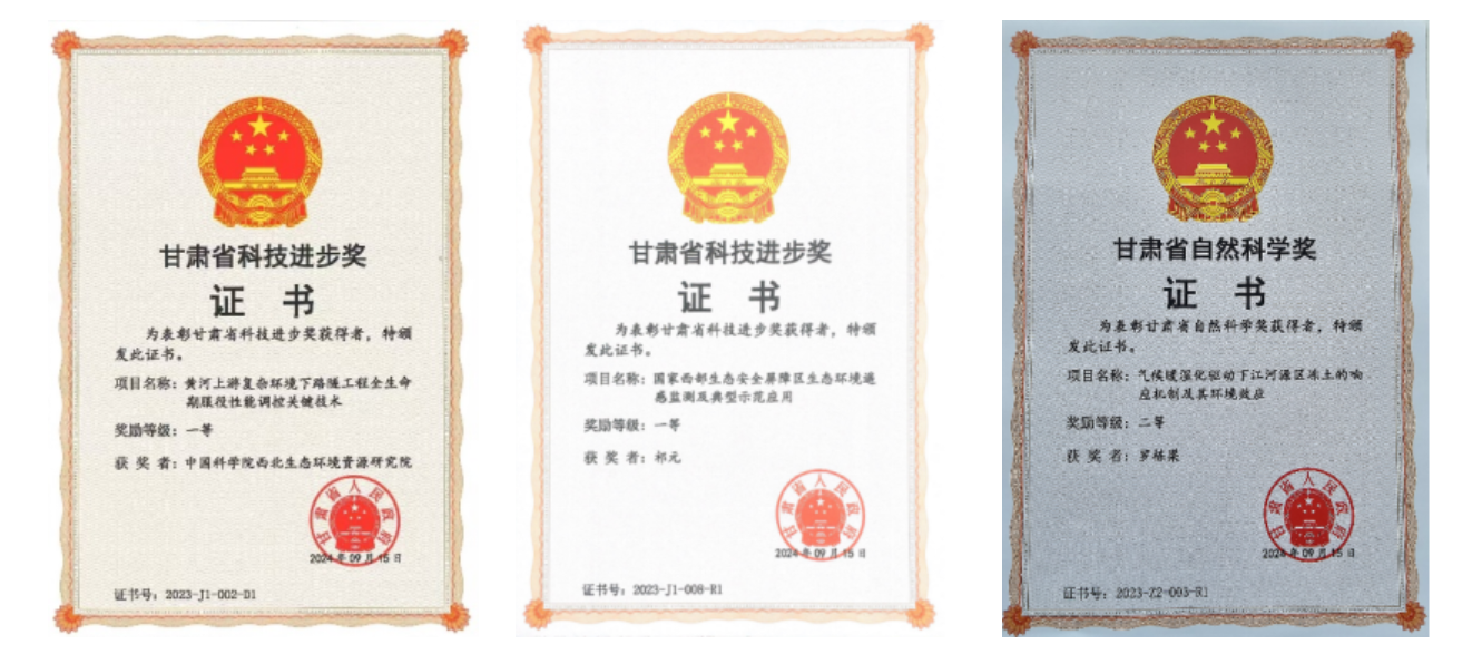 中国科学院西北生态环境资源研究院冰冻圈科学与冻土工程重点实验室李双洋团队主持完成的项目“黄河上游复杂环境下路隧工程全生命期服役性能调控关键技术”、祁元团队主持完成的项目“国家西部生态安全屏障区生态环境遥感监测及典型示范应用”获甘肃省科技进步一等奖,罗栋梁团队等主持完成的项目“气候暖湿化驱动下江河源区冻土的响应机制及其环境效应”获甘肃省自然科学二等奖。