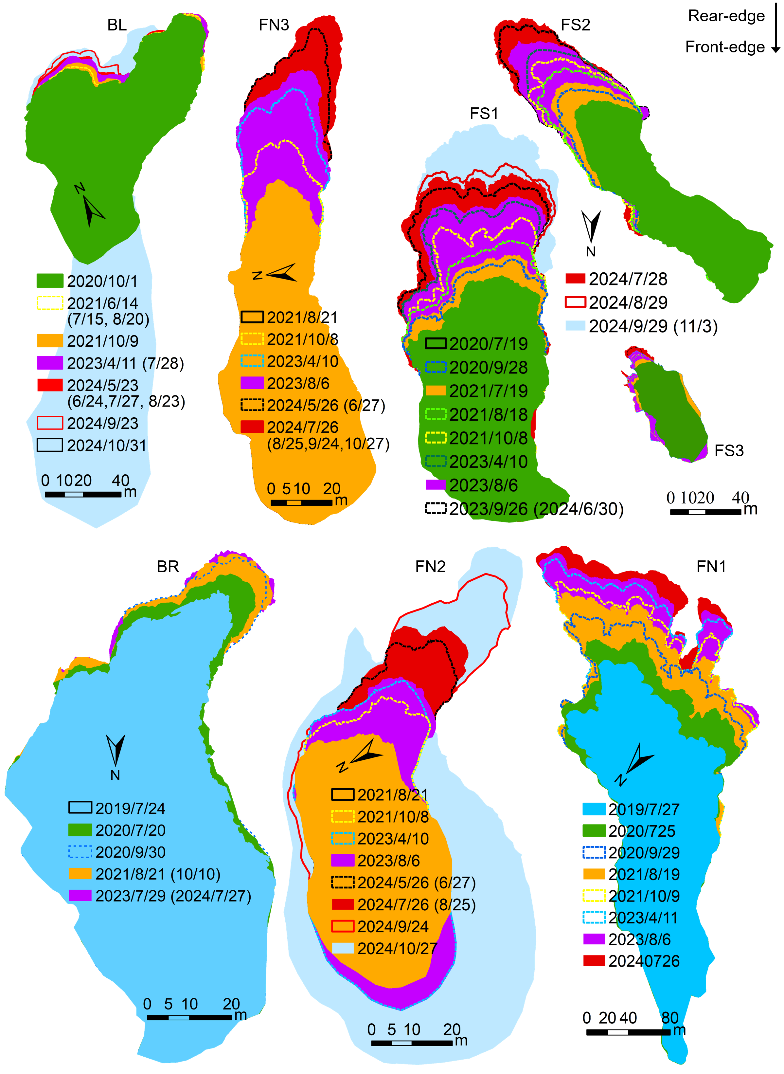 2019-2024年间,研究区热融滑塌整体呈持续扩张趋势,活动期集中在每年6~10月,其中9-10月最为剧烈;滑塌面积年均扩张约1182.9平方米,月均扩张约505.7平方米,其后缘后壁年均后退14.5米,月均后退6.2米。同时,研究精准量化了滑塌体内部地表物质的运动速率,明确了该速率自后缘向前缘呈递减规律,揭示了后缘后退与下坡物质搬运之间的紧密力学关联。
