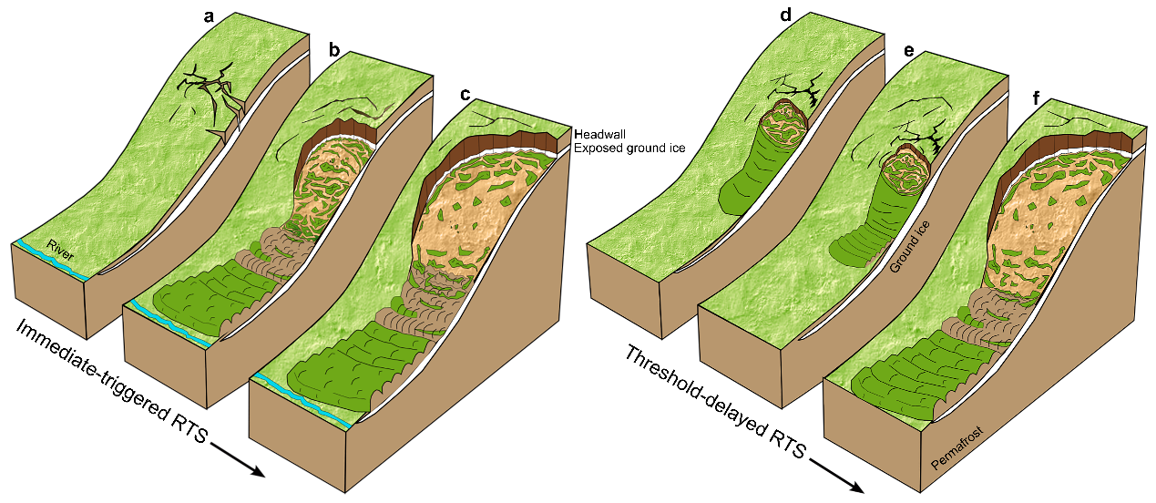 研究还识别出青藏高原热融滑塌的三种典型扩张模式,分别为突发增长型、持续增长型和停止增长型,并进一步揭示了两类代表性的热融滑塌演化路径:一类是在极端降雨、异常高温或坡脚扰动作用下快速大规模启动并持续扩张的即时触发型,具有明显的突发性;另一类是经历多年缓慢变形,在条件累积到临界状态后突然加速发展的阈值延迟型。这两类热融滑塌演化路径在灾害突发性和预警可行性上存在显著差异,对冻土灾害识别与风险管理具有重要意义。
